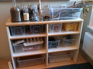 Jättebra att ha ett rum där ni kan göra en bygg. Tänk på att kanske ha några nivåer som är spänannde för barnen att sitta, bygga eller klättra över. Såga av ben på bord som har den yta ni önskar, eller gör som vi gjort ta gamla jalusiskåp och tippa dem 🙂 Annat man kan tänka på är färger, att material ni har ”går ihop”, olika struktur, tyngd, ljus och reflektion (speglar) är också viktigt 🙂