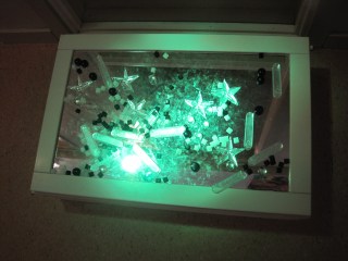 Nu för att binda samman stationen och för att använda mig av de komplement som finns till hands för att fördjupa så sänker jag nu taket med remsor av genomskinlig-ljusblåtonad plast. Jag hänger remsor från taket för att omhulda materialet och ge ytterligare en upplevese uppifrån. På väggarna ( stationen är placerat i ena delen av ett avlångt rum med en ingång närmasst kortsidan på ena långsidan) i hörnet använder jag speglar på båda sidor för att reflektera materialet och också för att kunna se ut i rummet bakom samt se mot andra sidan av det avlånga rummet. Speglarna gör att materialet ser ut att fortsätta in i väggarna och ger rymd samt ger en möjlighet att se sig själv. För att ytterligare förstärka använder jag ljuset och med hjälp av spottar riktar jag det ner mot materialet. Ytterligare sätt att stärka och locka kan vara att tillsätta ljud, prolande vatten, fågelkvitter, musik. Beroende på vad för stämning jag vill framkalla.