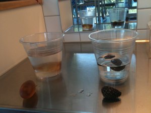 Min fd. kollega, som inspirerat mig mycket kring de yngsta barnens miljö, hade en två vacka avlånga bärnstensfärgade stenar som hon lagt i vatten i en genomskinlig hink. Stenarna var mycket speciella och såg ut som geléklumpar där i vattnet och var också olika beroende på om de var blöta eller torra. Dessutom fanns där en hink med två kottar, en i hinken och en utanför. Den utanför torkade och spretade, öppnade sigmedans den i vattnet slöt sig. Jag tyckte det var jättespännande och ville gärna testa detta hos mig på torget. Döm om min förvåning när jag hittade precis en sådan sten som min kollega hade haft i ett av materialskåpen på torget. En dag efteråt så hittade en av mina nuvarande kollegor en sten till i ett annat skåp. Så nu har torget fått denna fina lilla upplevelse att värna som jag fick av min fd kollega.