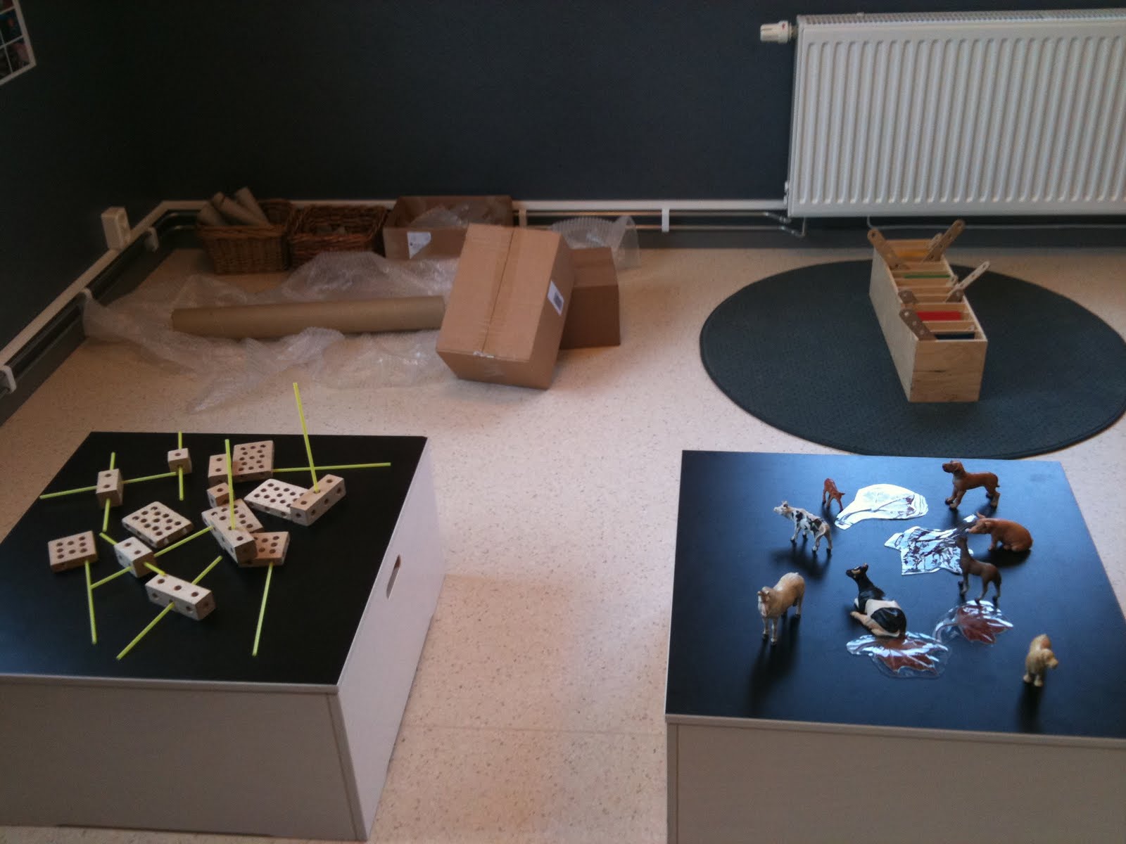 En av de svartvita kuberna fick djur på sig och ska kompleteras med naturmaterila av pedagogerna och barnen. Mer material behövs och ska kompleteras allteftersom barnen lär känna de material som finns nu men detta är en start!