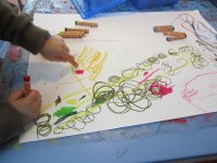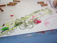 Det jag nu vill göra var att få dem mera uppmärksamma på hur former, linjer, mellanrum formar bilder. Jag erbjöd därför oljepastellkritor som har vackra distikta färger men ändå en begränsad yta för att kunna täcka. Barnen kom till ateljén där jag dukat upp tre A2-papper där två barn fick dela ett papper och alla kritorna låg mitt på bordet ovanpå papprena. Barnen valde sina platser och började måla. Alla sex var intensiva i sitt målande och blandade färgerna ovanpå varandra. Jag upplevde det som att de här gjorde som de brukar i mötet med ett nytt material, de utforskade motståndet, kritans färg, mötet med pappret, kraften, intesiteten. De pratade inte om vad de gjorde utan de ”bara” gjorde. Snart uttryckte de att de var färdiga och gick vidare till andra saker.