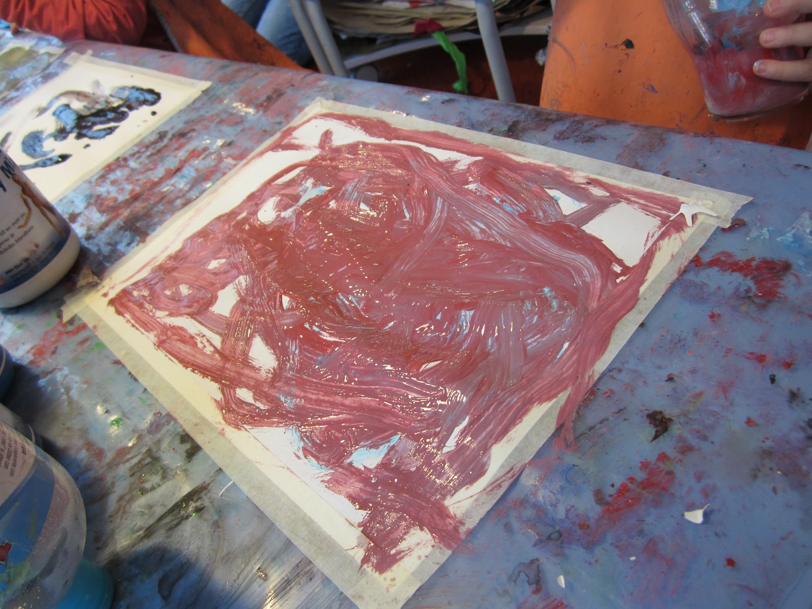 Jag upplever att färgerna och penslarnas uttryck, konsistens och känsla ger barnen signaler om att just hälla, blanda, smeta så att de har gjort detta är ju inte så konstigt. Det är ju första steget i att lräa känna ett material att få prova hur det reagerar, hur man kan behandla det. Jag tänker också att barnen har en förförståelse nu för vad man gör med täckfärgen, att det just handlar om att blanda och smeta.