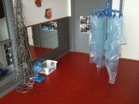 När jag packade ihop och plockade fram före semestern hade jag lite tankar om hur jag skulle forma miljön i ett första steg. Jag minskade på mängden material på torget för att få tydlighet men var noga med att se till att variationen fanns kvar. Jag valde mer större material och lät Rampen få en central roll på en halvan av torget. På mitten av torget fick en OH flytta in samt några stora rördelar (stora nog för att rymma små barn) och skira tyger som barnen har gömmt sig i, sovit i, badat/simmat i. Min tanke var att de yngsta barnen brukar visa intresse för att utforska med sin kropp, klättra upp och ner, vara i, gå runt o.s.v.