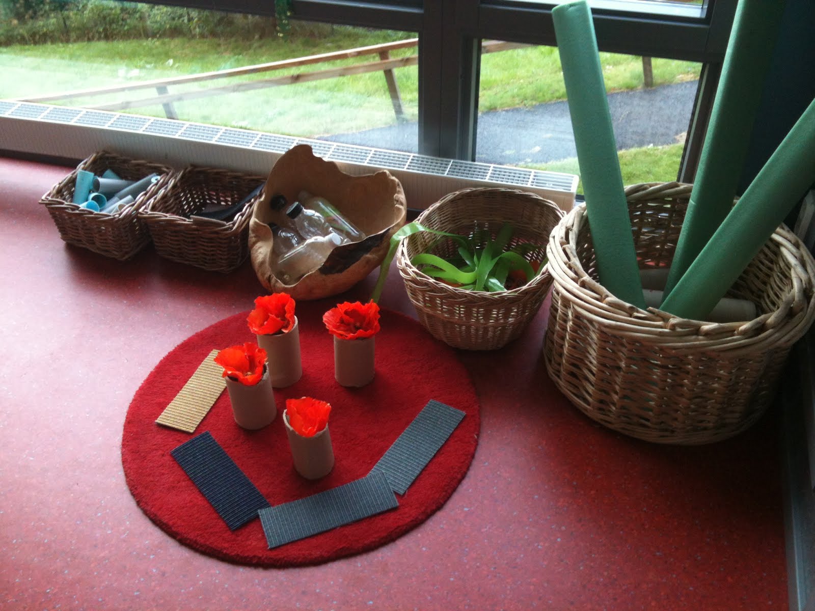 En lite hörna med returmaterial. Genomskingliga flaskor med olika saker i; ris, kikärtor, klockor, bönor. Här finns plastspolar, mattremsor, papprör och plastband. De gröna långa är plastemballage. De är fantastiska! Vi fick dem idag av en förälder. Barnen har hittat mängder med olika sätt att använda dem, bl.a. på rampen.