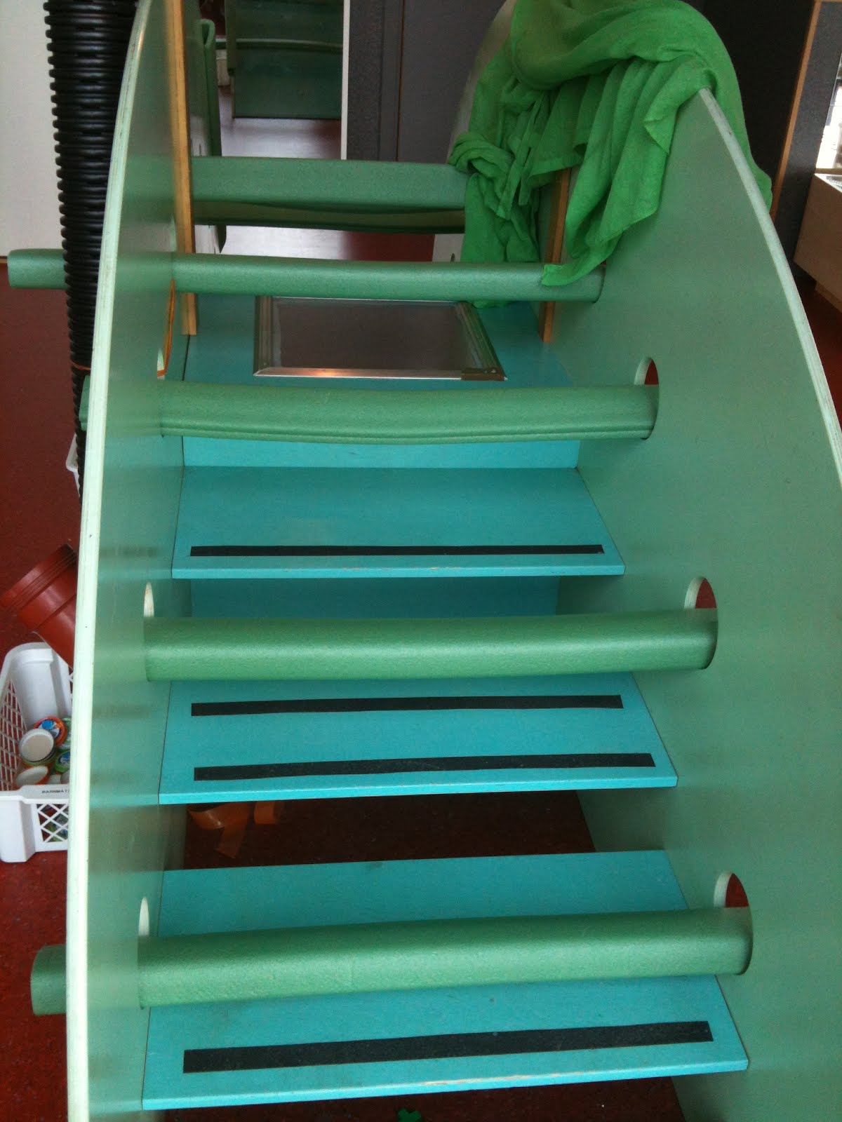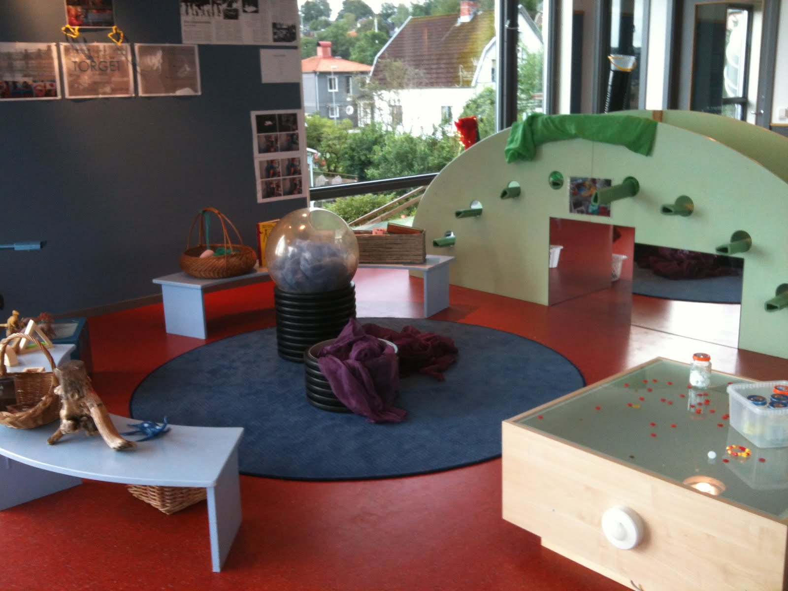 När jag packade ihop och plockade fram före semestern hade jag lite tankar om hur jag skulle forma miljön i ett första steg. Jag minskade på mängden material på torget för att få tydlighet men var noga med att se till att variationen fanns kvar. Jag valde mer större material och lät Rampen få en central roll på en halvan av torget. På mitten av torget fick en OH flytta in samt några stora rördelar (stora nog för att rymma små barn) och skira tyger som barnen har gömmt sig i, sovit i, badat/simmat i. Min tanke var att de yngsta barnen brukar visa intresse för att utforska med sin kropp, klättra upp och ner, vara i, gå runt o.s.v.