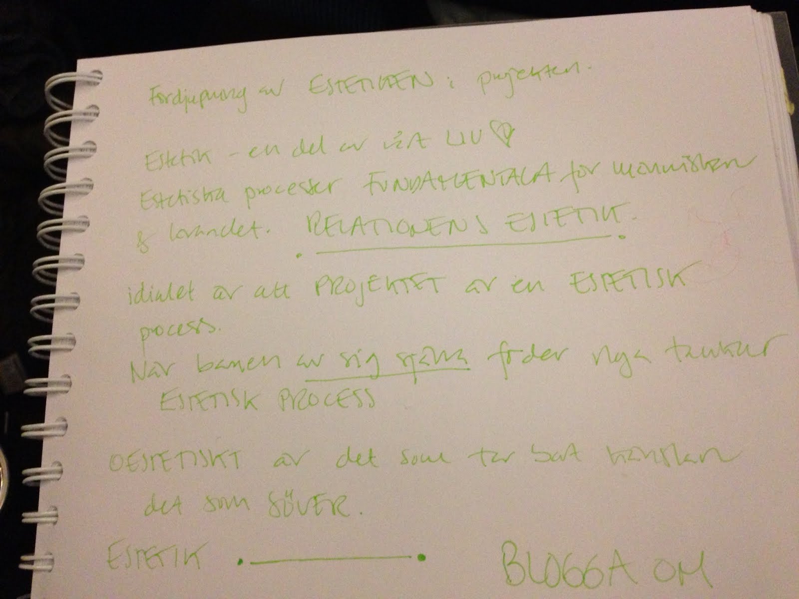 Under dagen snappade jag åt mig en tanke som jag tänkte var särskilt viktig för mig just nu. Det var tanken om hur estetik inte bara kan förstås som harmoni i synliga, konkreta objekt/miljöer utan också kan förstås som en känsla för eller i något. Cristian berättade om hur de har tänkt mycket på relationens estetik och hur viktig estetiken i projekten är och då som ett driv, en harmoni, ett flöde för kreativitet och nyfikenhet. Att de verkliga estetiska läroprocesserna har med balans att göra. Estetiken i projekten är den energi som håller intresset vid liv, det som föder nya frågor. Cristian gjorde ordleken på egelska aesthetic (estetik) och anesthetic (likt oestetisk) som är den drog som används när man söver människor. En drog som får oss att domna bort. Jag drar paralleller till det vi upplever som meningsfullt, där vi på något sätt förstår förbindelsen mellan mig själv och andra, mellan mig själv och världen.