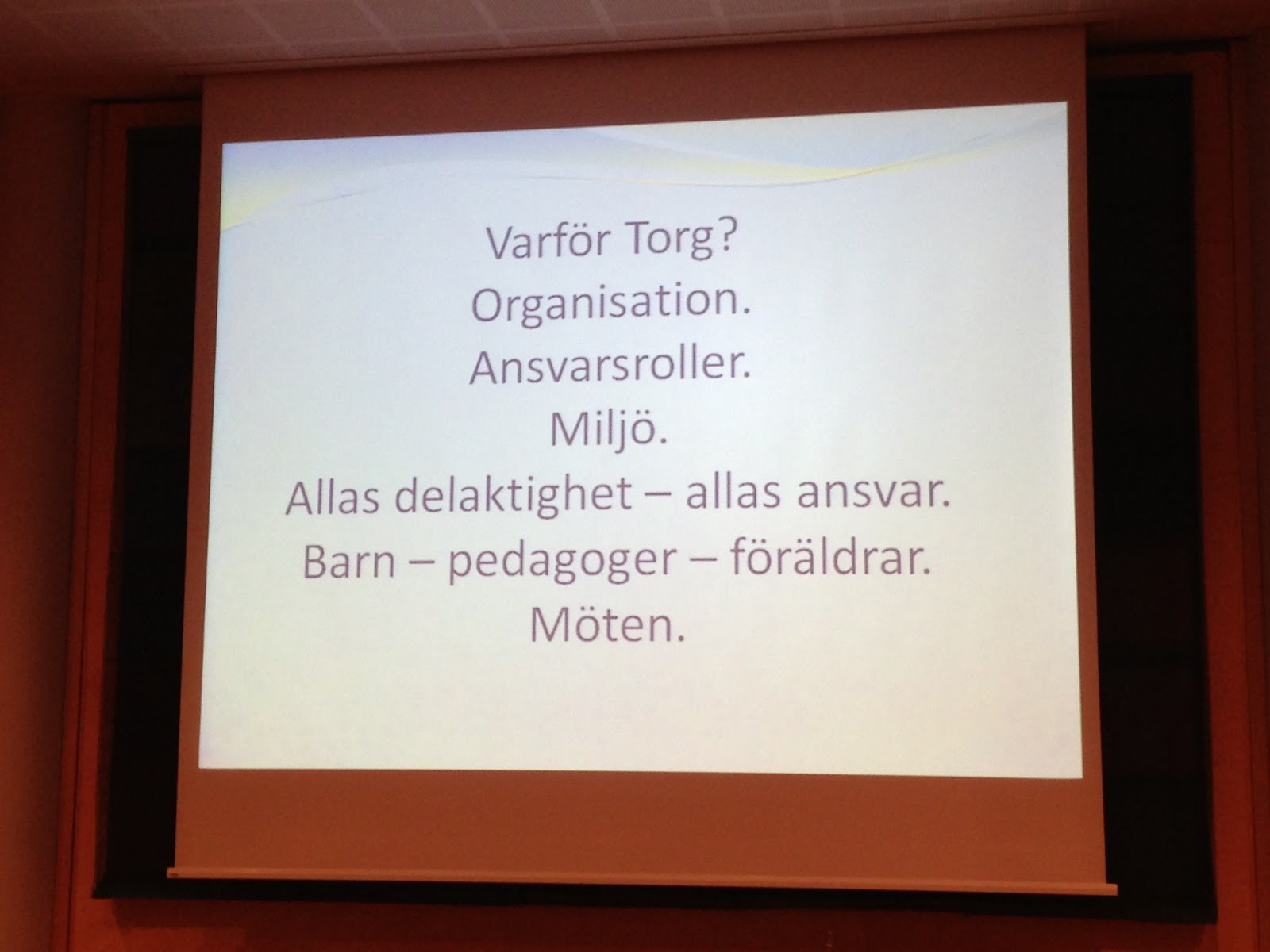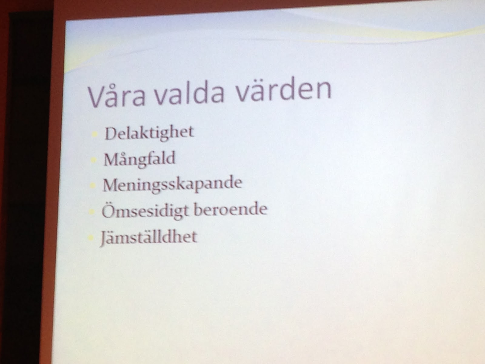 Christina berättade om hur de tillsammans arbetat fram en verksamhetsidé som bygger på ett antal värdeord som de vill att hela deras verksamhet ska genomsyras av (ovan) . I allt de gör. Jag gillade att det blev så konkret! Det är så lätt att formulera en massa tjusiga ord men man kommer igen vart förrän man rent konkret kan visa på hur det blir i verkligheten. Christina berättade om hur hon t.ex. kan ta en konkret sak som en bygghörna och fundera över värdeorden där. Hur kan man skapa en bygghörna som bygger på delaktighet, som visar mångfald, meningsskapande osv? Jag tänker att vi kan inspireras av Trollets förskola här, att verkligen gå på djupet i våra miljöer och vårt material, i det som barnen är i varje dag. Vågar vi titta så nära på vår verksamhet? Jag tänker att det är väldigt intressant att göra detta för det ger väldigt konkreta saker att diskutera. Christina var noga med att allt måste få ta tid, att det är en process.