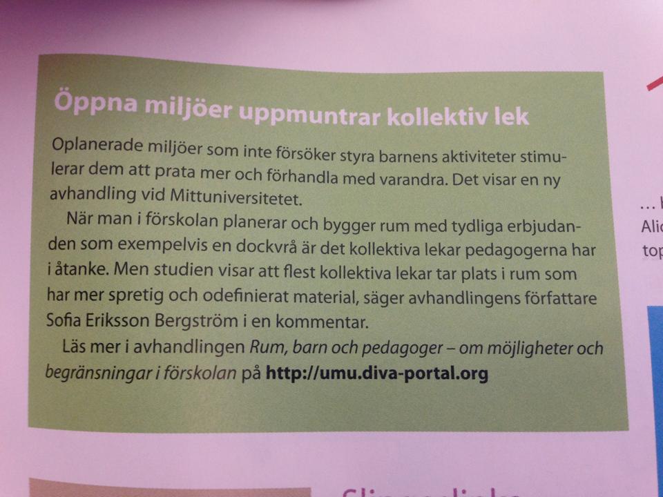Ett litet tips på en doktorsavhandling av Sofia Eriksson Bergström på pedagogiska institutionen vid Umeås Universitet Rum, barn och pedagoger -om möjligheter om begränsningar i förskolans fysiska rum.