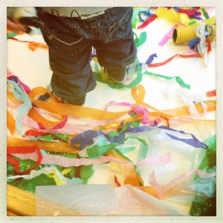 Vidare kan man tänka att utmana med färgat cellofan i stora bitar, remsor av tyg och plastband, ballonger, plastväxter, ficklampor…tja…