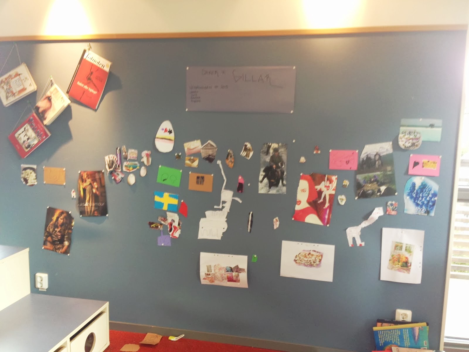 Nu har vi börjat inventera. Nya gruppen på utmaningen har barn och vuxna från olika grupper. Nu behöver vi lära känna varandra och oss själva i den nya gruppen. En bra plats att börja var att fundera på vad vi gillar. Så vi har börjat skapa ett collage vid vår mötesplats. Här sätter vi upp allt vi gillar. Vi har klippt och ritat, barnen kom på att man kunde fota också om man hade något hemma som man gilla. Vårt collage ska växa och vi ska knyta trådar mellan varandra. Spännande att se vad det leder….