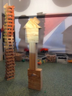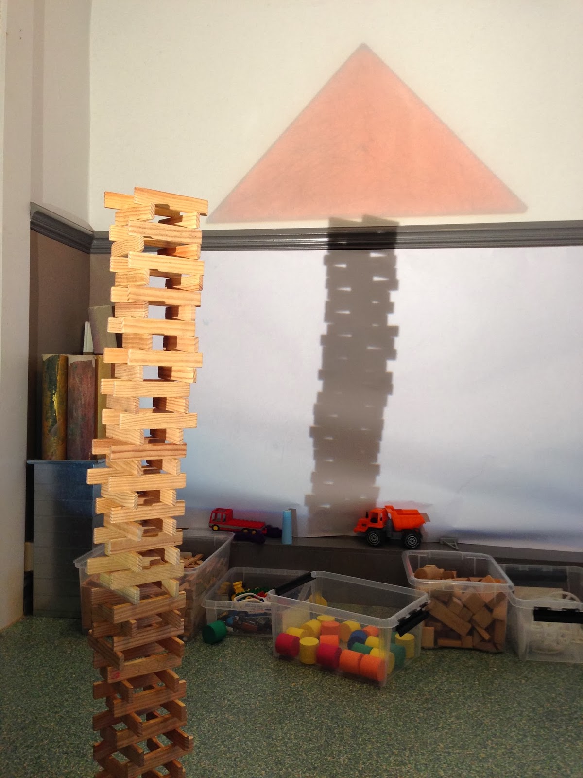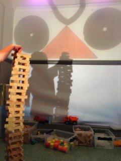 I byggen har OH:n tagit plats för att skapa effekter för byggena. Igår arbetade tre barn en lång stund med att skapa skuggor på väggen genom att skapa höga torn. Efter en stund kom de på att de kunde bygga vidare på sina skuggtorn med hjälp av OH:n och materialet på den. De provade att lägga till former och färger till sina skuggtorn.