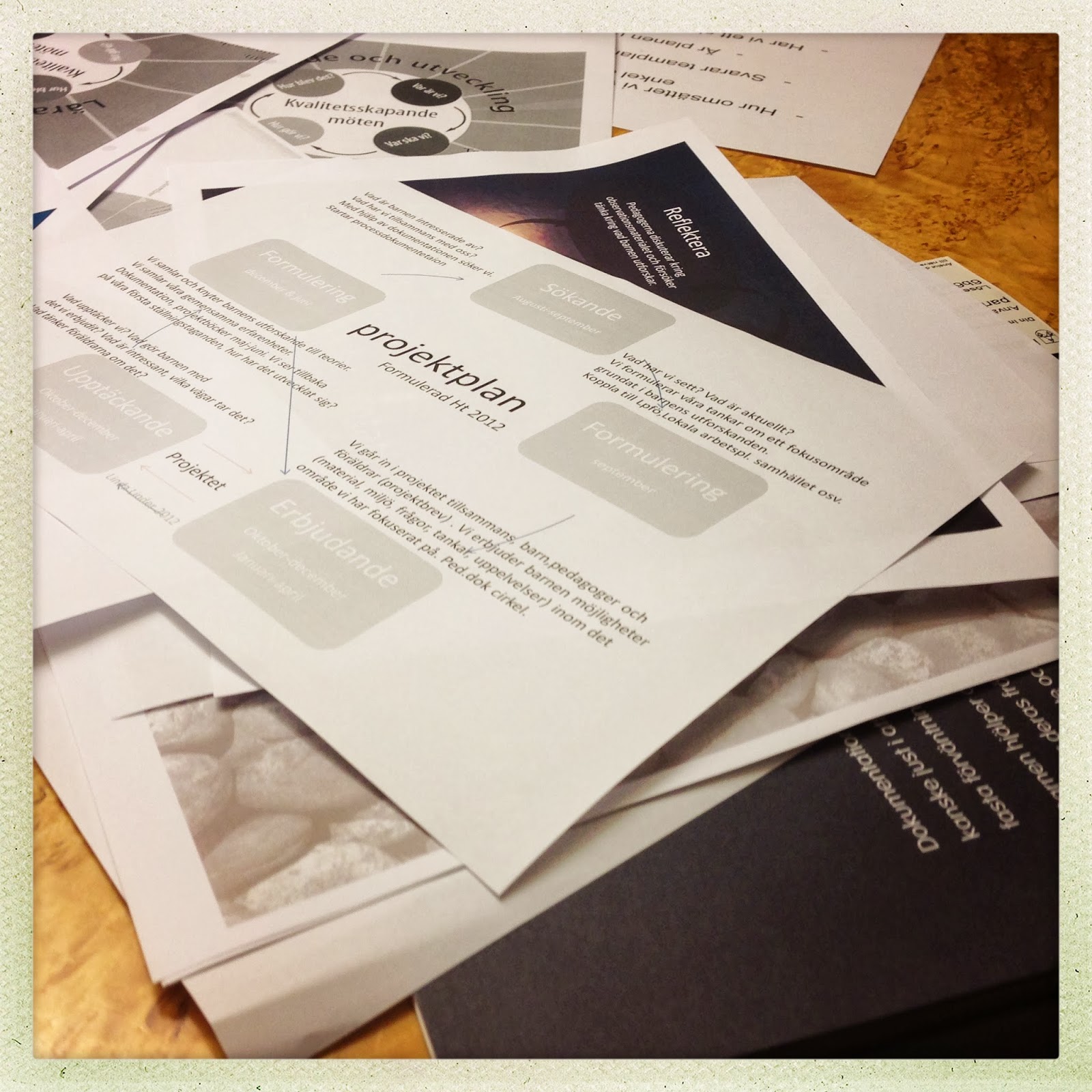 Inspirationen kommer först och främst från Trollets förskola i Kalmar och sedan från mina erfarenheter i Kärra. Utifrån detta har vi sedan skapat vår gemensamma tanke. Den framarbetades och gick ut på remiss till pedagoglagen i november i höstas. Nu har pedagogerna gjort en första utvärdering och det är överlag positivt. De tycker det är bra att vi har ett gemensamt verktyg som vi kan använda i många olika områden, att det finns frågor som skapar fokus, det de behöver arbeta med är att lyckas med att ha rätt fokus på sina reflektioner, att hela tiden utgå från teamplanen och inte fastna i praktiska göranden utan lyfta arbetet till meta-nivå först. Det är svårt och kräver både mycket arbete med att reflektera och att ständigt koppla till bilder och filmer för att förankra. Just nu ligger det mycket text i teamplanerna, något som jag hoppas ska övergå i bilder och filmer när arbetet med den pedagogiska dokumentationen fördjupas. Tanken är att samordnarna på ska kunna hjälpa till att fördjupa arbetet genom att agera samtalsledare vid reflektionerna framöver om vi får ihop det.