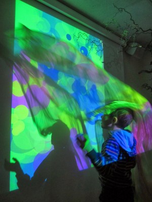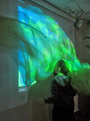 I vårt utforskande av olika kreativa appar så har Bloom varit en app som lockat barnen. Här i projektion och i samspel med genomskinligt tyg i olika färger. Barnen fångar färgerna/bubblorna på tyget när de kastar det i ljuset från projektorn. Bubblorna lever på tyget och barnen böljar bilden med hjälp av tyget när det flyger. Stor förtjusning, skratt och förundran.Tre stycken barn är med. Två av dem kastar tyg och den tredje styr bubblorna och färgen. De turas om och provar olika.