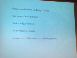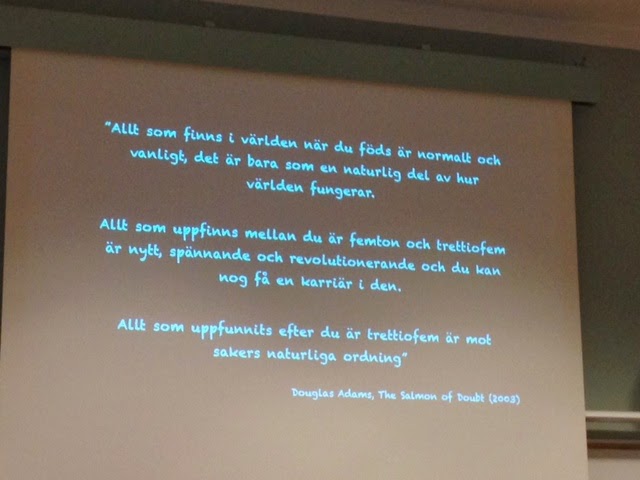 Det som också har spridit sig mycket och som flera förskolor har börjat arbeta med mer och mer är projicering. Att projicera har gjort att sammanhanget runt datorn eller plattan blir större och att det också vidgar sinnesupplevelsen. Flera barn kan delta/inspireras/hitta vägar att utforska med hjälp av projiceringen. Det möjliggör också för större interaktion med resten av den fysiska miljön. Detta visade Markus exempel på i hur de byggt/hängt upp föremål att projicera på. Detta är också exempel som jag sett från Remida i Reggio Emilia och andra förskolor runt om i Sverige. Något som verkligen växer och det kittlar min tanke i hur de pedagogiska miljöerna kan utvecklas och förändras med hjälp av detta. Hur kommer framtidens lärmiljöer se ut och hur kan man tänka när man bygger förskolor om man tar med projicering som en möjlighet?