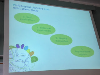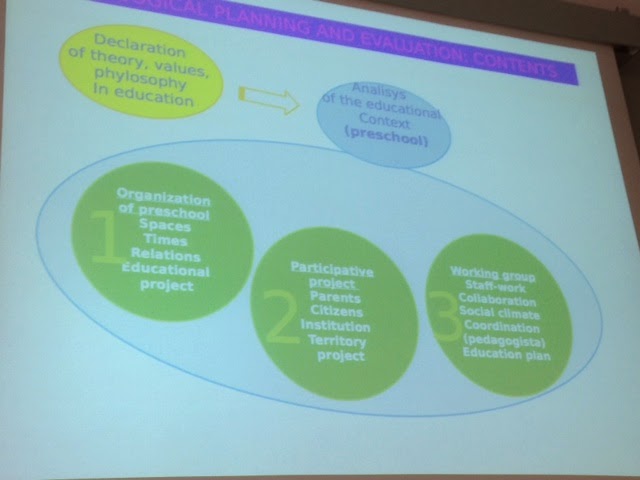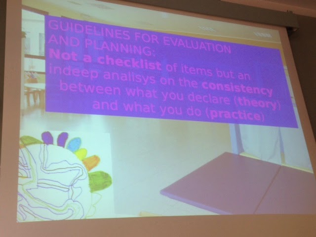 Hela planen är uppbyggt på ett system där man gör större utvärderingar vart tredje eller fjärde år. Då gör alla förskolor självvärderingar utifrån samma frågeställningar. Först beskriver man sitt sammanhang, sin kontext. Var befinner vi oss? Sedan måste man också uttala sina teorier och sin filosofi, sina ställningstagande helt enkelt (?!) på förskolan. Cristian tryckte verkligen på detta, att man behöver säga något om sin verksamhet, uttala det man vill och önskar med den. Oavsett på vilket sätt man arbetar, inget behöver vara bättre än det andra, men alla måste tänka på hur, vad och varför de gör som de gör. Ta ställning. Det är viktigt att säga samma sak i teori och praktik, det är ditåt vi strävar.