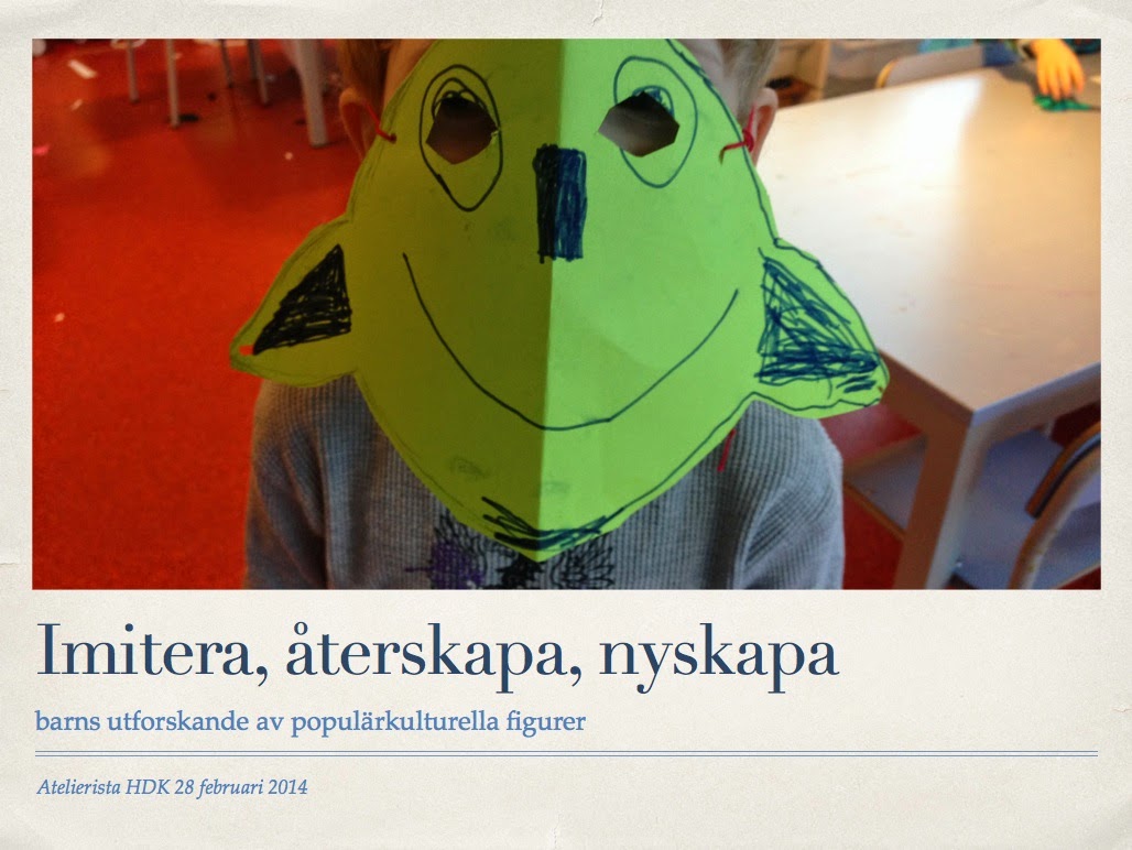 I torsdags gjorde jag min andra föreläsning på Atelieristautbildningen i Göteborg på Högskolan för design och konsthantverk. Det var en föreläsnings som jag skulle hållt i februari men var sjuk i nån slags eländig influensa då. Föreläsningen handlade om projektarbeten utifrån barns populärkultur med ingången Imitera, återskapa, nyskapa. Denna rubrik var inte bara ett sätt att beskriva barnens arbete utan också vårt arbete som pedagoger och vårt liv som människor. Att få idéer, prova dem på det sätt man tror de ”är”, återskapa något som blir ens eget och sedan faktiskt nyskapa utifrån dessa erfarenheter.
