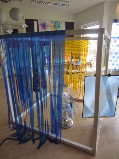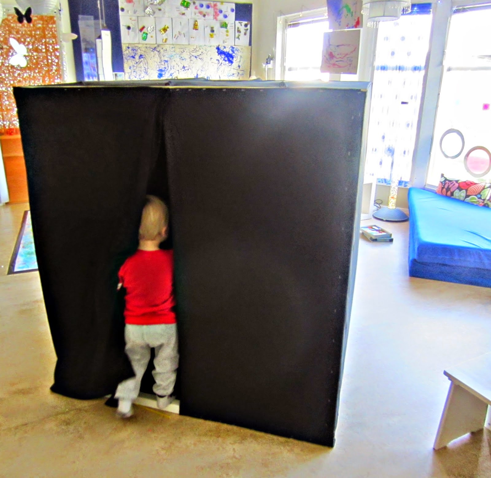 På förskolan Syrenen har vi några olika kubvarianter. Vi har en svart kub som skapar en nyfikenhet och lust att gå in och utforska insidan av kuben. Att du inte ser in i kuben utifrån utan aktivt måste kliva in i den ökar nyfikenheten och spänningsmomentet. När man är inne i kuben upptäcker man att insidan inte alls är svart utan vit och att man med hjälp av olika ljuskällor kan ändra detta mini-rums färgsättning och mönster.