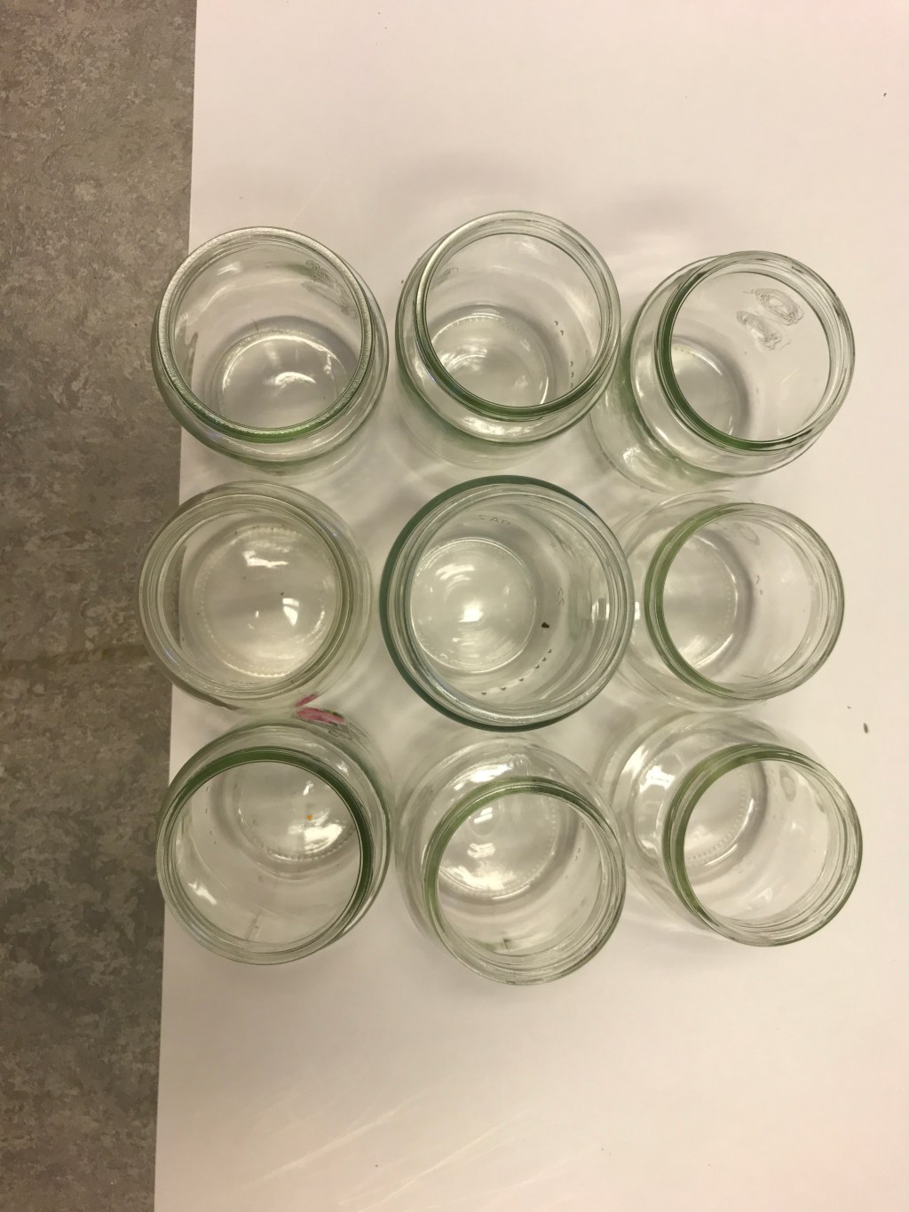 Idag kom en förskolegrupp till Tredje Rummet som hade en massa små glasburkar med lock, barnmatsburkar, som de ville bidra med. Burkarna låg i tre platspåsar men jag hörde att det var glas de hade med före de berättade och plockade fram. Jag vet aldrig vad barngrupperna har med för material, det är en del av grejen att låta materialet och barnens handlingar bestämma vad workshoppen ska ha för idéer och fokus. Det är lite läskigt varje gång för man har som pedagog inte särskilt mycket kontroll. Man måste lita till barnen och materialet och sin egen förmåga att plocka upp idéer och tankar i stunden. Idag kände jag mig lite trött, som man kan göra ibland. När jag förstod att det var glas barnen hade med så började jag tveka. Vad skulle vi göra med dem? Vi hade ju haft mycket fokus på att bygga med materialet och jag kunde inte riktigt tänka hur vi skulle göra det med burkarna. Som jag brukade så bad jag barnen ta upp materialet ur kassarna och ställa ut dem på golvet på två stora vita kartongark.