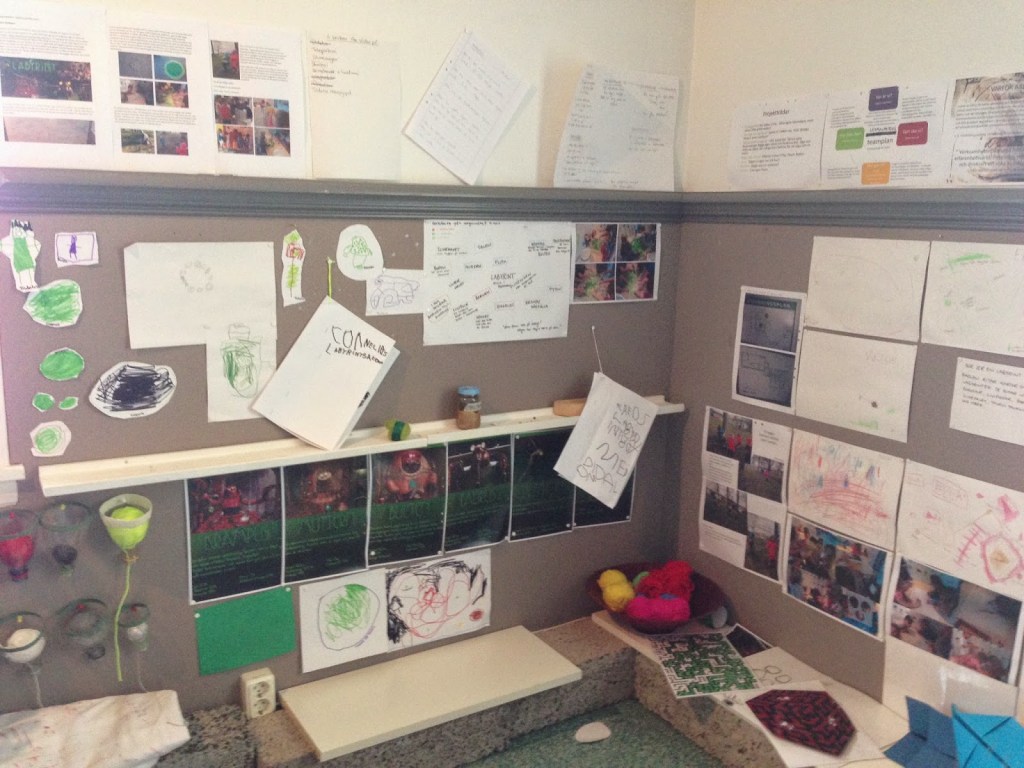 Till hösten påbörjar vår förskoleenhet ett år av undersökande om hur vi tillsammans skapar vår gemensamma förskoleberättelse. Som du kan läsa i inlägget ”Att tillsammans och systematiskt leta efter ett gemensamt hur” så har våra senaste fyra år handlat om hur vi skapat en gemensam riktning i arbetet och sökt formen för den. Tredje rummet har varit ett ställningstagande som har tagit en fysisk form. Till hösten påbörjas arbetet om att synliggöra, koppla ihop och skapa de former för berättelsen som behövs för att berätta våra fyra förskolors, barnens och de vuxnas berättelser. Formen ska finnas för både barn och vuxna i förskolan och för familjerna. Det finns redan många berättelser men formen för uppsamlandet är olika. Under snart två år har vi lyfta fram de kollektiva väggarna där vi samlar spår från våra undersökanden, vi har gett pedagogerna enskilda reflektionsböcker och vi har en digital berättelse om barngruppernas processer för varje storarbetslag. Nu ska vi snart förhandla med våra lärledare om hur vi ska fördjupa arbetet. Vad blir viktigt på riktigt? Vad gör skillnad för hur vi tillsammans bygger förskola, upplever gemenskap och utvecklar våra sätt att spåra?