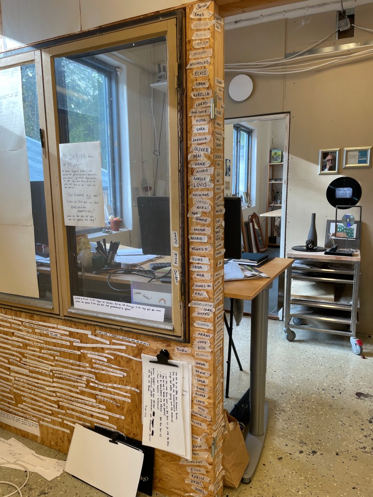 I arbetet med tredje rummet har jag det senaste också funderat mycket på vad dokumentation är. En dokumentation som överraskade mig och min kollega under hösten var tejpbitarna med barnen och pedagogernas namn som sparades på väggen efter varje besök. Vi hade inte tänkt så noga på dem mer än att vi ville spara dem. Det som hände var att de växte till en massa små spår av alla de barn och vuxna som arbetat i tredje under hösten. För barnen blev de intressanta när vi berättade att det var namnen på alla som varit här. Barnen letade efter namn de kände igen, pratade om vilka de andra var och förundrades av att det var så många. I vårt gemensamma tema Del av något större blev dessa små tejpbitar en väldigt viktig dokumentation som gång efter gång påminde oss om varandra.