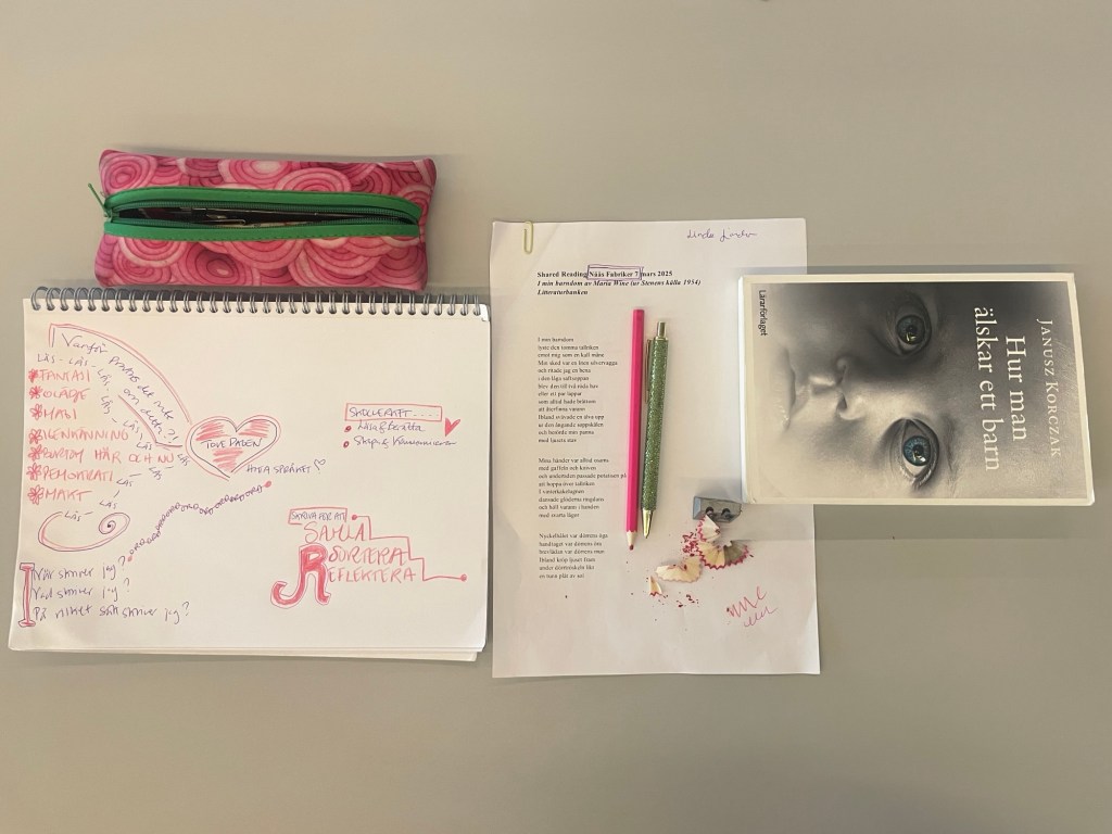 Vad känner du? var den första frågan av våra tre reflektionsfrågor, som vi lånat av konstnären och pedagogen Jan von Boeckel. Frågorna Vad känner du? Vad ser du? och Varför gör vi det här? avslutade alltid våra fördjupningsmöten där alla pedagoger på vår enhet deltog. Mötena var en injektion av estetiska upplevelser och en slags mjukare version av Julia Romanowskas Schibbolet-effekten. Hela vårt utvecklingsarbete bygger på att som Romanowska beskriver i sin forskning utveckla ledarskapet hos oss alla genom mötet med estetiken och de livsetiska stora frågorna som all grundläggande mening utgår ifrån. Jan von Boeckels frågor introducerade vi i arbetet för sex år sedan när vi började utforska estetiken i relation till oss själva och de har följt oss sen dess. De har verkligen hjälpt oss att hitta roten i våra egna upplevelser och hur de påverkar processerna i den utbildning vi gör för barnen. De är en temperaturmätning för hur provocerande, relevanta, känsliga eller ihopkopplat det innehåll för utveckling som vi valt är. När vi stötte på Romanowskas forskning ett par år in i vårt arbete var det som en befrielse och en hand på axeln som fick oss att fortsätta och lyssna mindre på de som kallade oss flummiga.